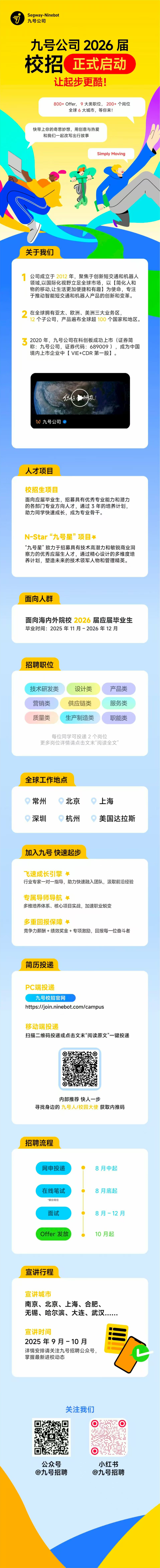 九号公司2026届秋季校园招聘正在进行中,作为聚焦智能科技,智慧出行,机器人领域,可根据公司核心业务调整的创新企业,本次校招招聘岗位众多,麻烦您安排工作人员将长图推送至贵校就业公众号,招聘简章上传至就业信息网,下方社群宣传文案可以在26届就业社群进行宣传