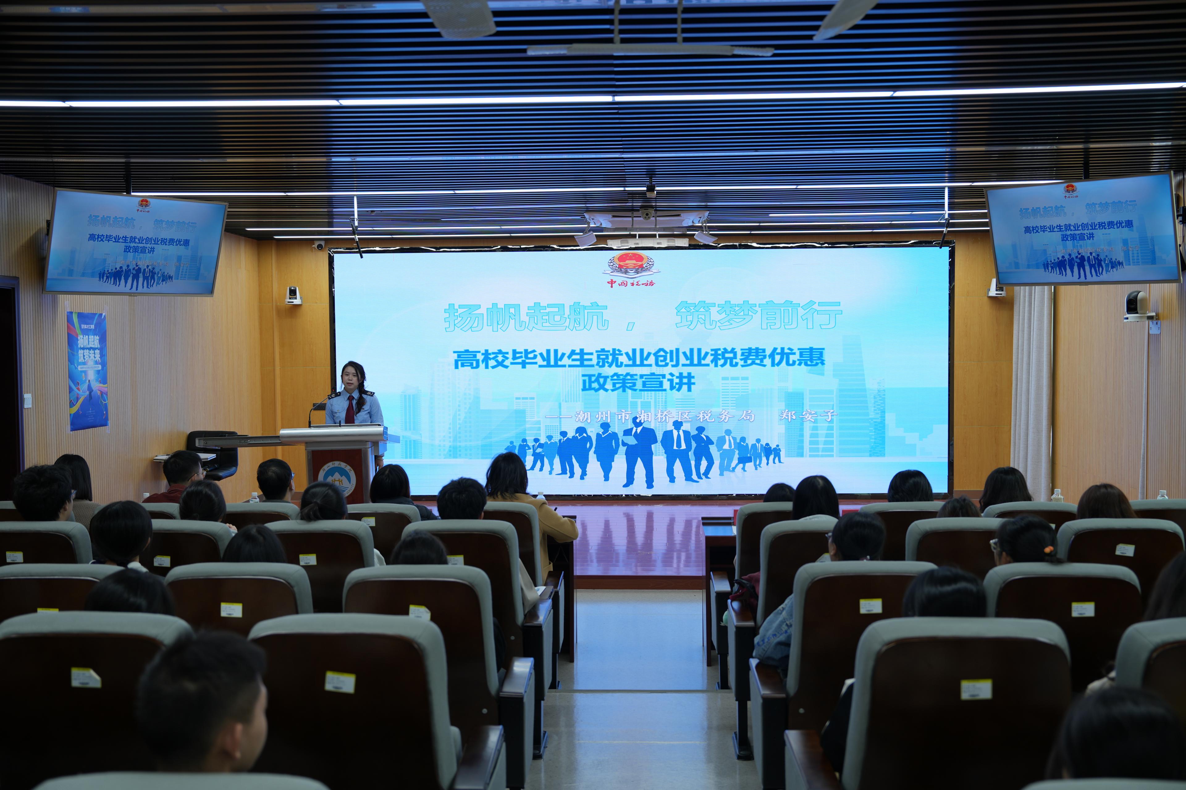 11月19日,我校学生工作部、学生就业指导中心联合国家税务总局潮州市税务局、潮州市人力资源和社会保障局、潮州市教育局以及共青团潮州市委员会在信息科技大楼C704报告厅举办“百万英才汇南粤——扬帆起航 筑梦未来”高校毕业生就业创业宣讲活动。